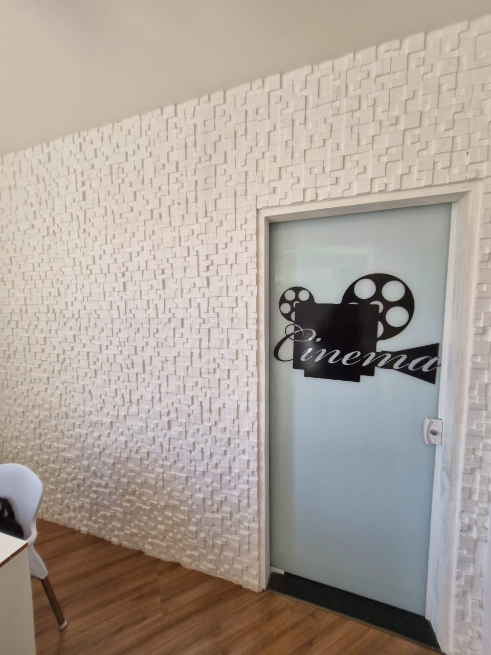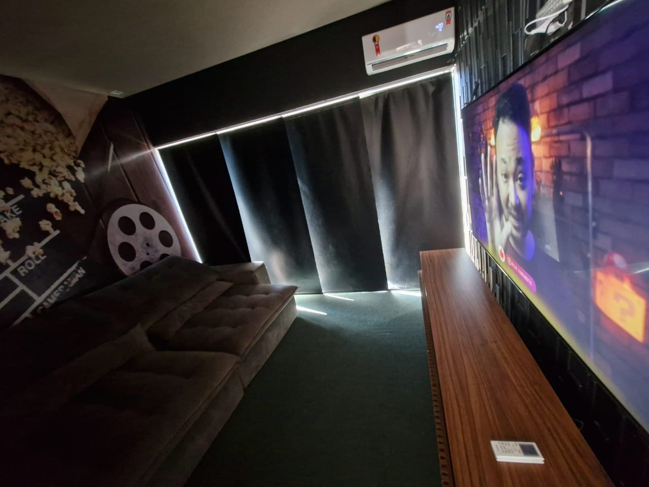 Cinema privativo com uma TV de 75”, oferecendo uma experiência de cinema em casa