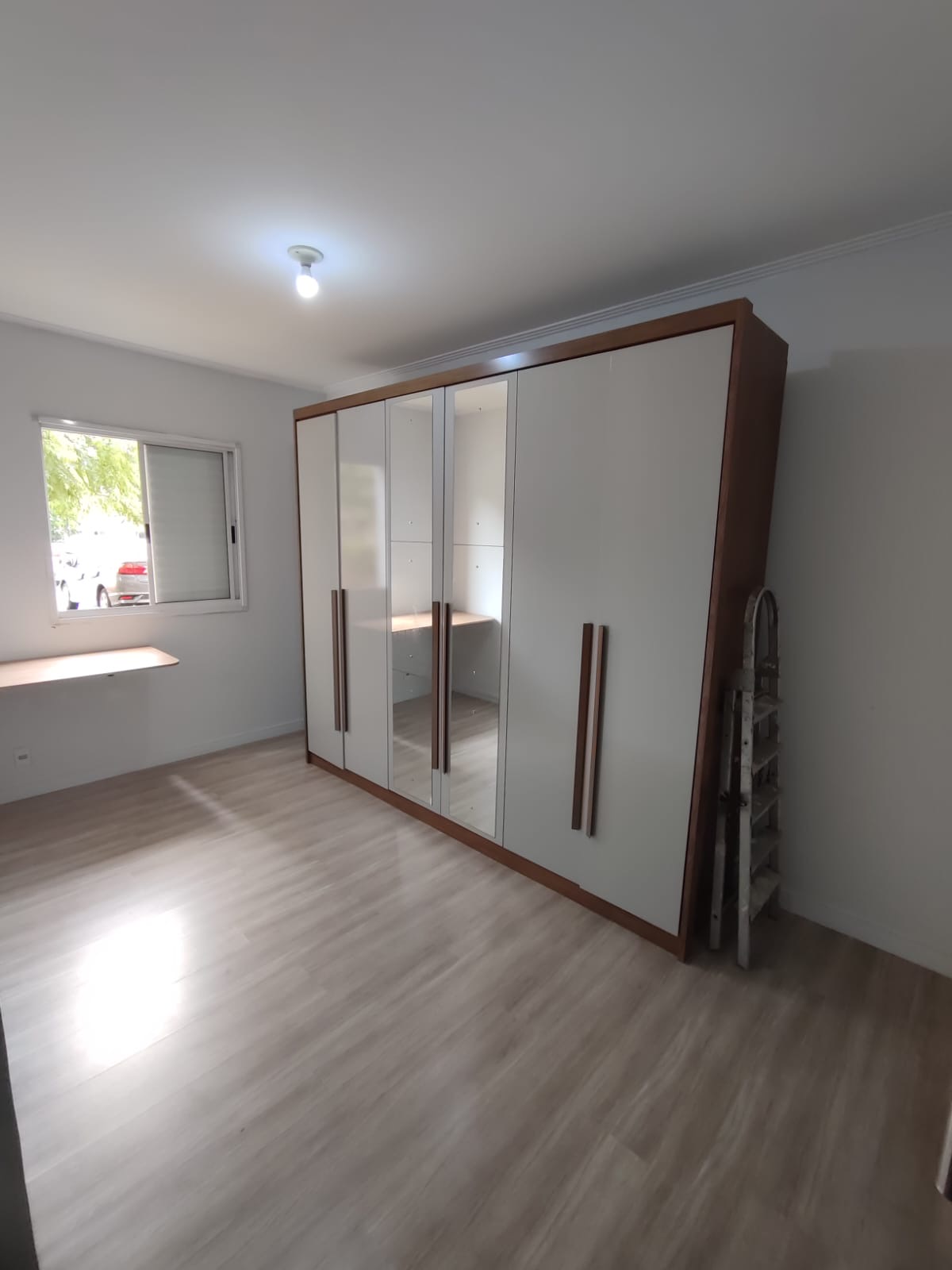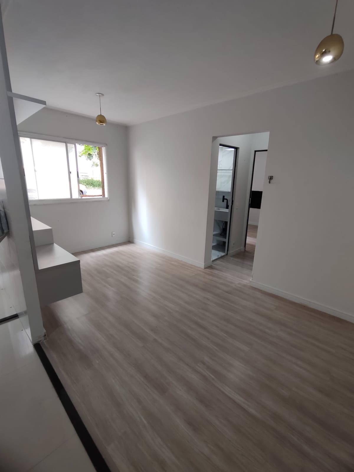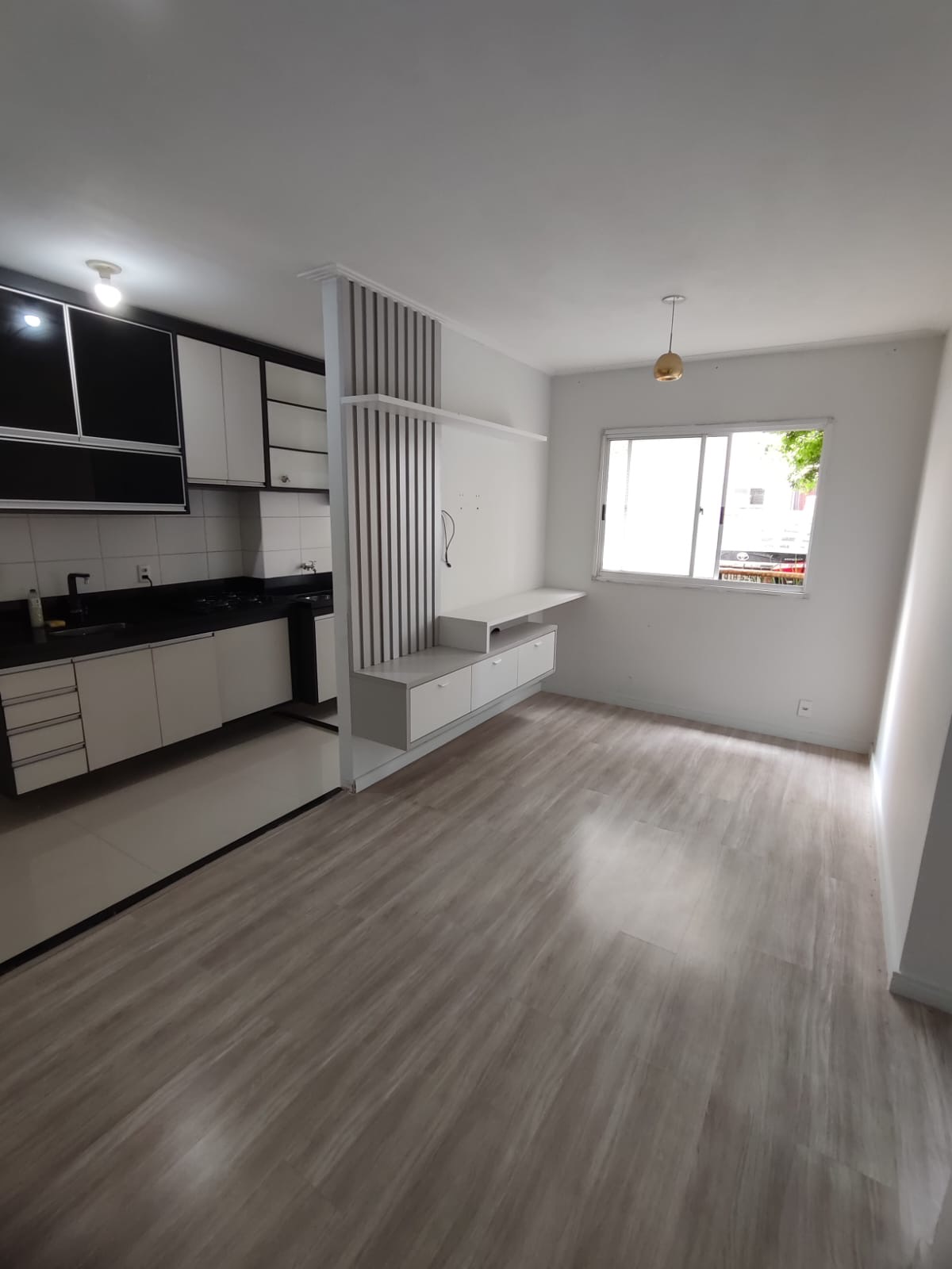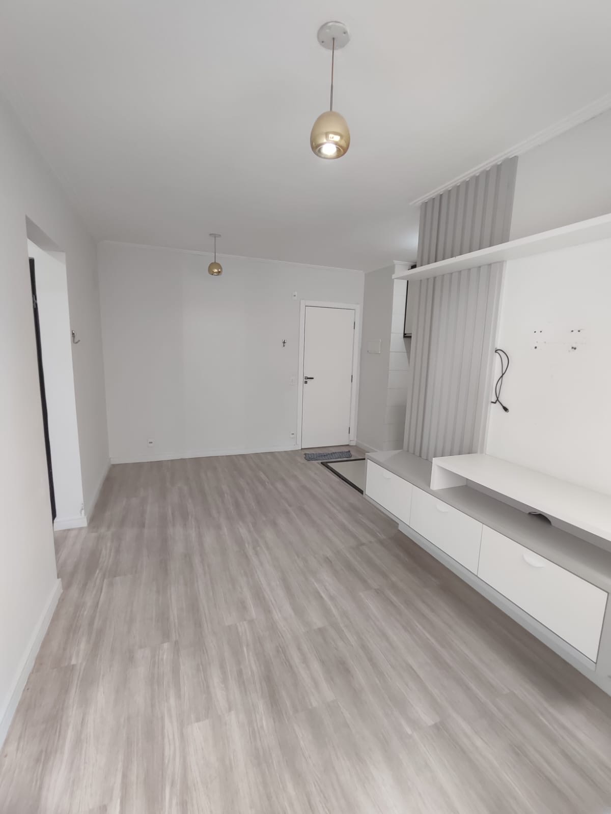 Na sala, o ambiente é moderno e acolhedor, com painel e gaveteiro planejados, ideal para compor um espaço confortável para receber visitas ou relaxar. O piso laminado é novo, trazendo ainda mais charme e sensação de cuidado ao apartamento.