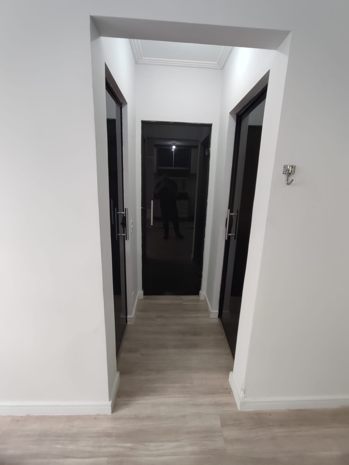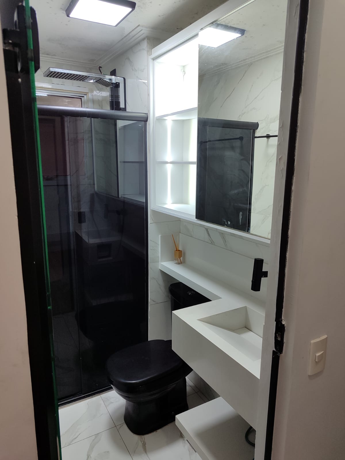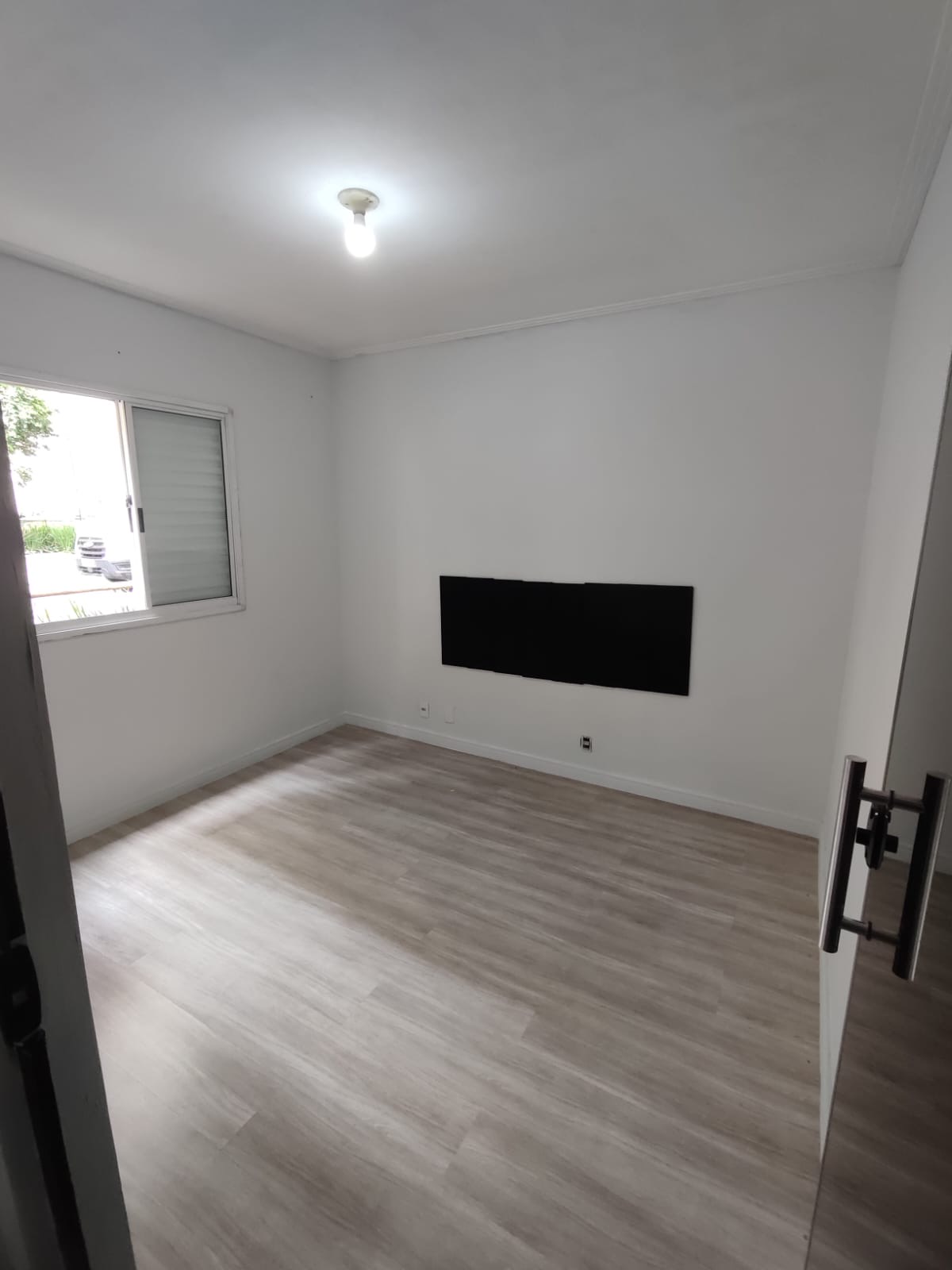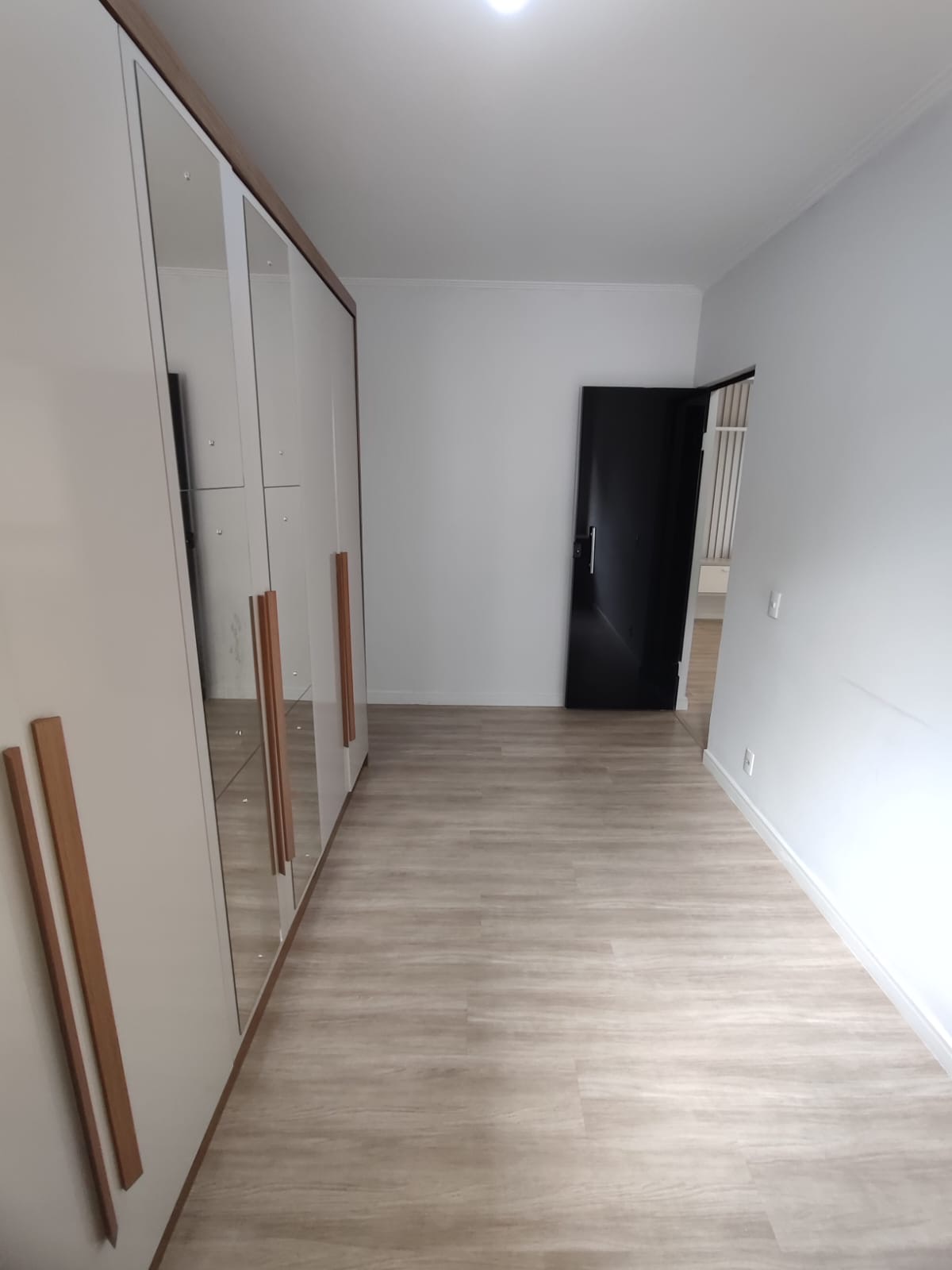 Na sala, o ambiente é moderno e acolhedor, com painel e gaveteiro planejados, ideal para compor um espaço confortável para receber visitas ou relaxar. O piso laminado é novo, trazendo ainda mais charme e sensação de cuidado ao apartamento.