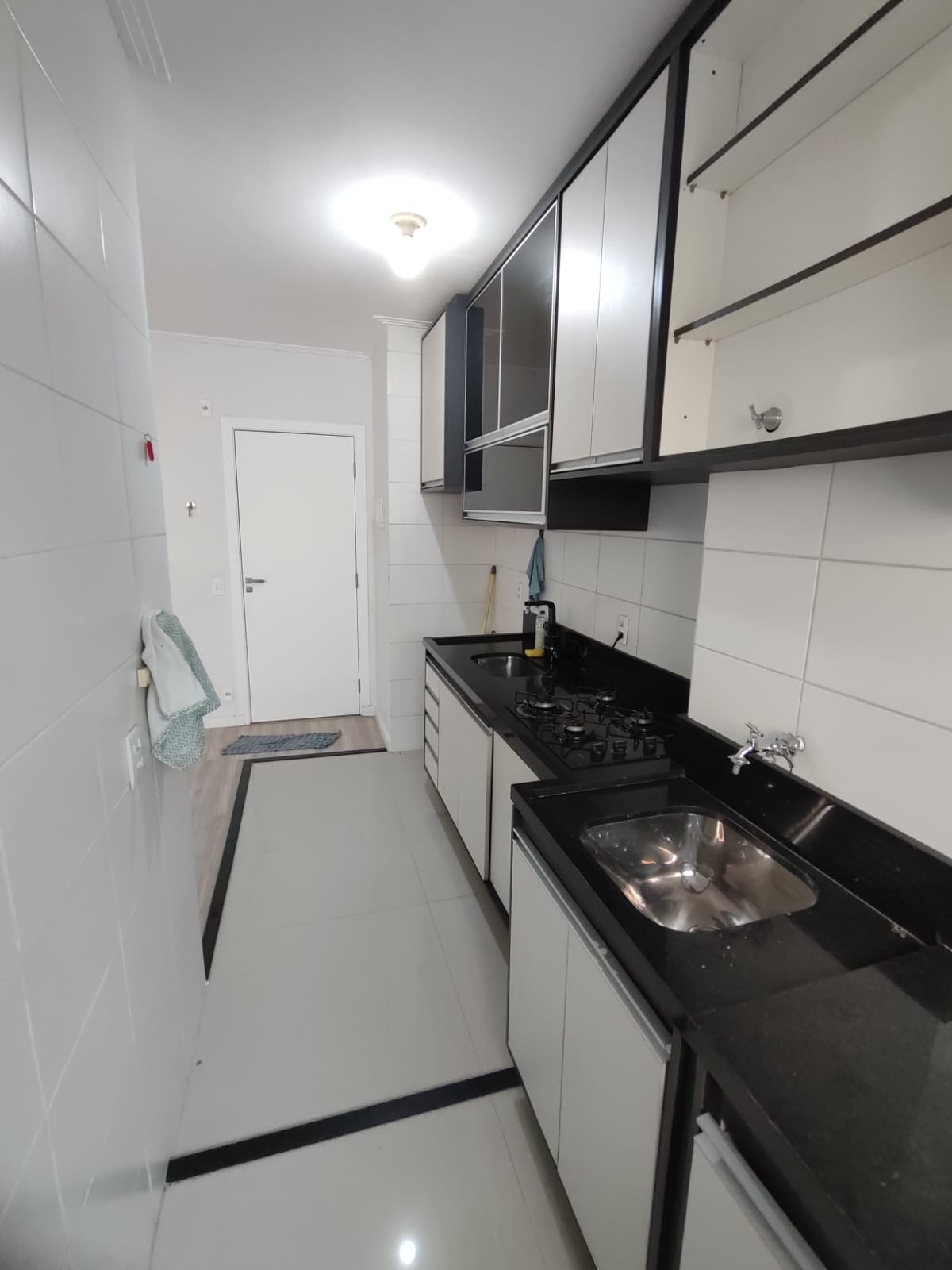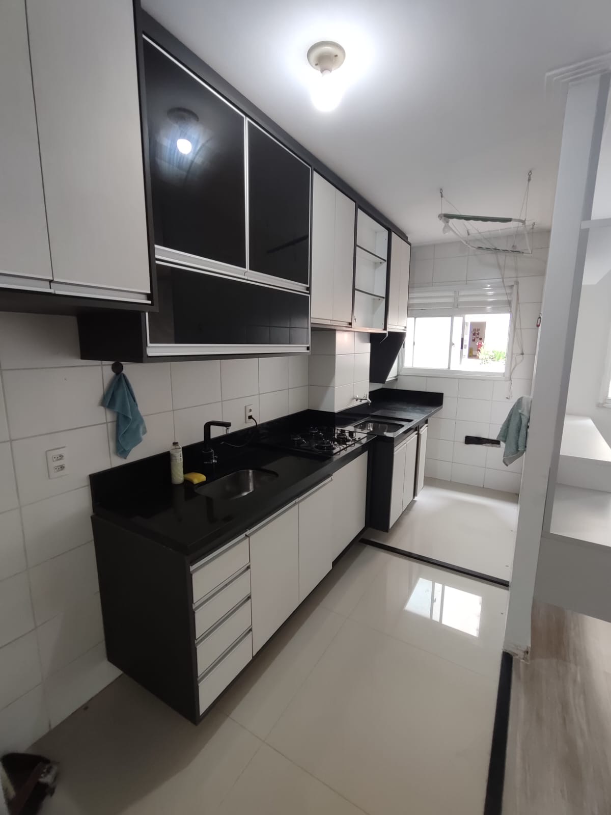 A cozinha possui armários planejados e já está equipada com fogão, oferecendo funcionalidade e organização no dia a dia.